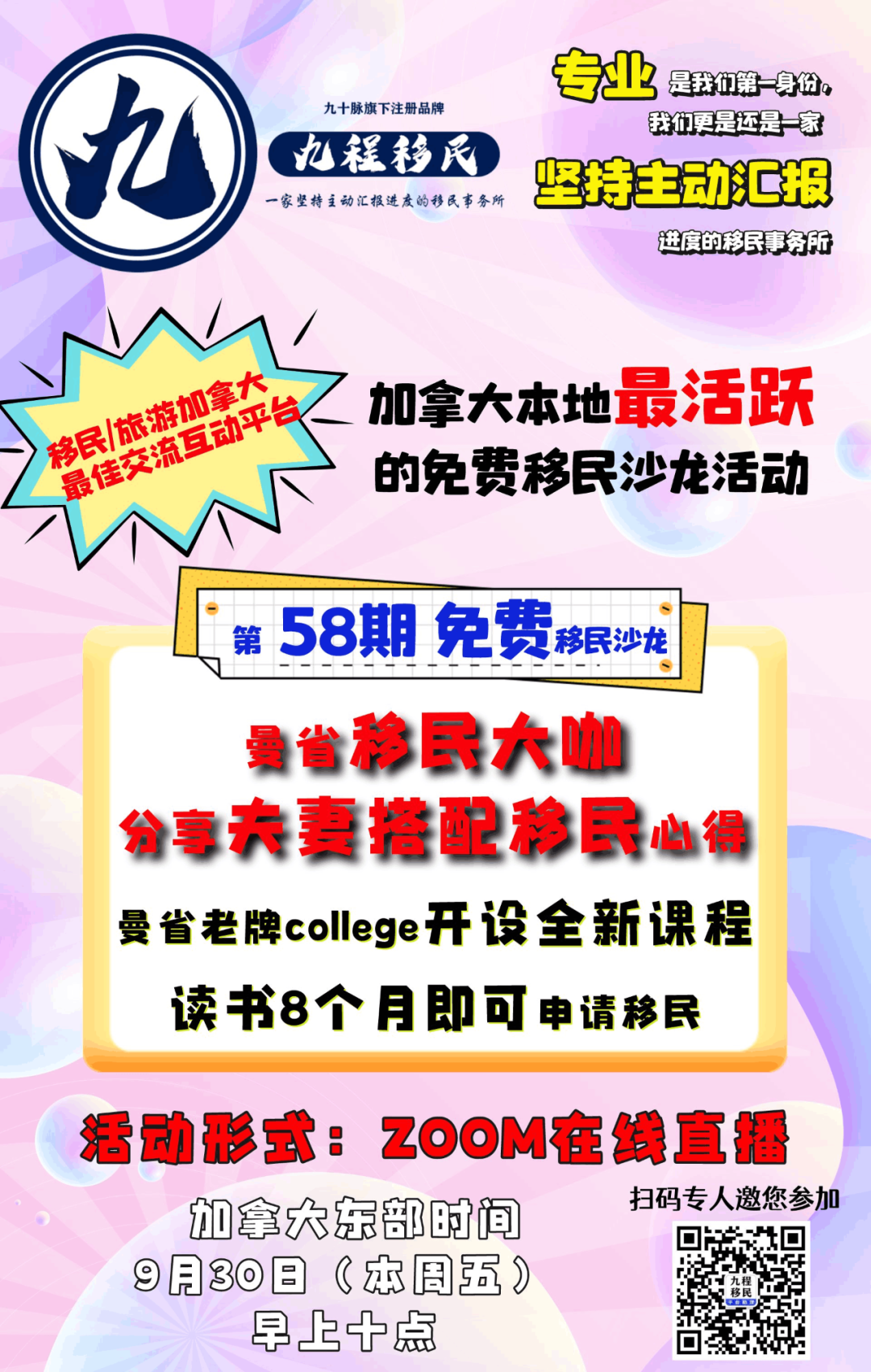 欢迎参加九程第58期移民沙龙活动,本周五(9月30日)早上十点准时开始,扫描下方海报即可进群参与。