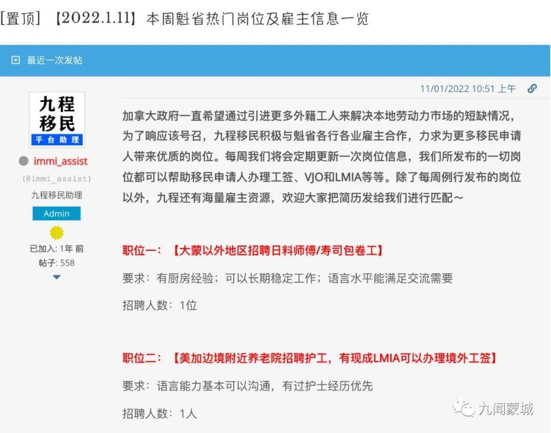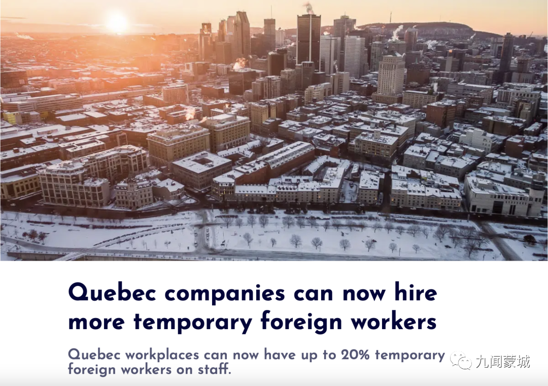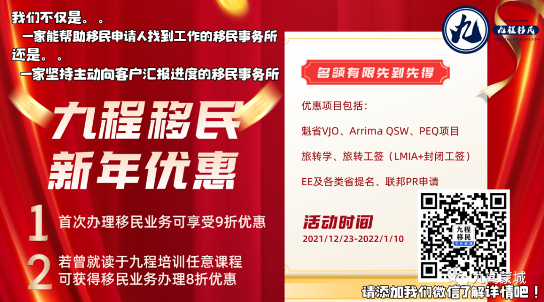 预计魁省政府今年会推出另外一个利好政策,目的是为境外CSQ持有人发放大约7000个工作签证,使这些申请人能尽快抵达魁省开始工作,缓解当地劳动力短缺情况。为了积极响应魁省政府招聘外籍工人的号召,九程移民积极与魁省各界雇主合作,每周将定期更新一次岗位信息。欢迎大家扫描下方二维码查询本周最新工作信息!