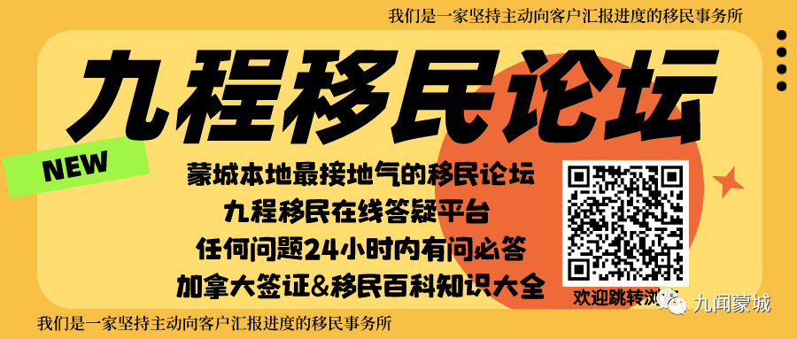 「九程移民」作为移民界中的“媒体人”,坚持一周多次更新,不漏过任何一条移民新闻和干货,给大家带来最新、最快、最全的加拿大移民留学及出入境等信息与资讯。一站两个栏目全面覆盖,紧跟加拿大移民风向。除了固定的移民推文以外,九程移民还有微信交流群和移民论坛欢迎大家加入讨论。