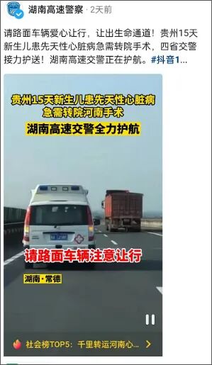 在贵州交警的护送下,救护车很快就来到了湖南境内,湖南交警接过这一棒,开始全力护送。