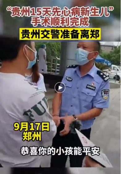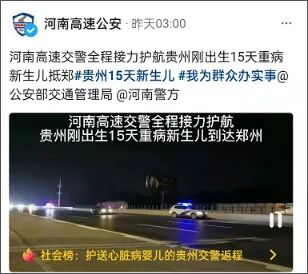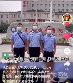 首先是贵州交警,他们并不只是一小段接力,而是担心小宝宝的安危,3000里的一路护送,直接送到河南省胸科医院。