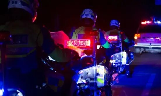 河南交警摩托车尾灯的显示屏上,全部都写着宝贝加油的字样,这是交警们在为宝贝加油打气。
