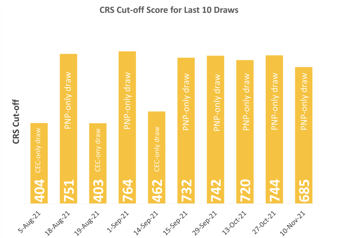 加拿大当地时间11月10日,联邦移民部公布了最新一轮Express Entry项目的抽签细节,本轮共有775位省提名PNP类别的申请人获得邀请,而本轮所要求的分数线也非常低,只需要685分即可获得邀请。省提名类的申请人通常在获得省提名证书之后可以在CRS评分系统中获得600分的加分,那么也就意味着申请人只需85分即可获邀。