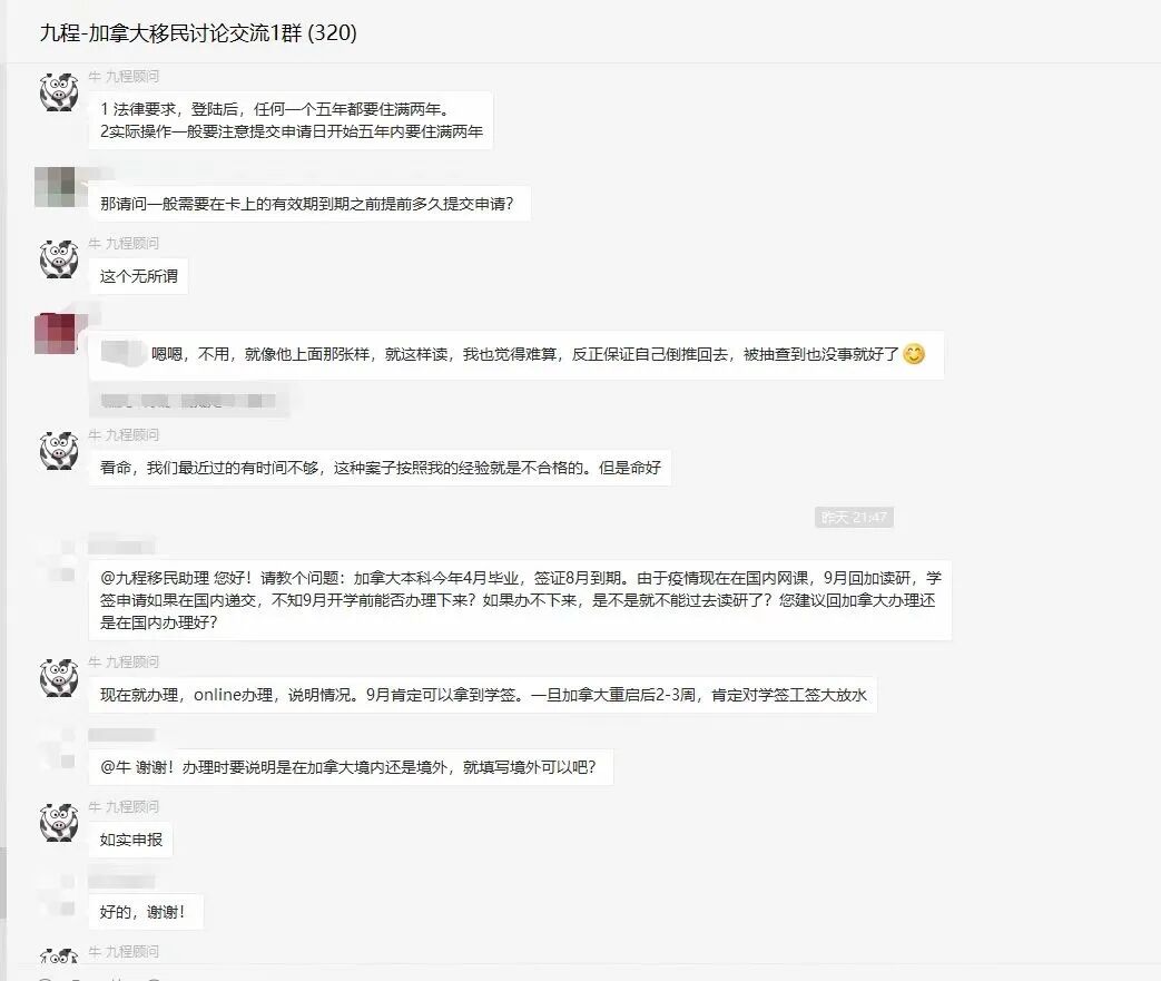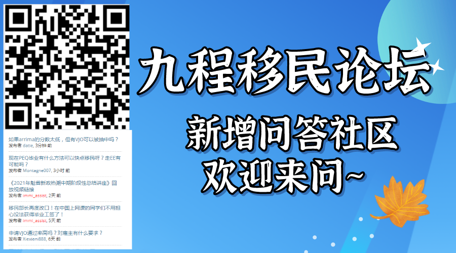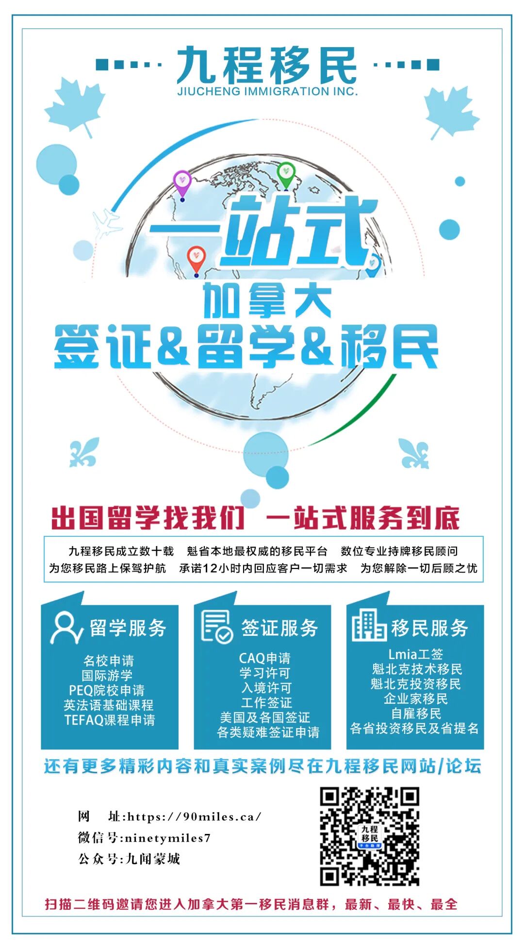 昨天晚上,九程移民顾问亲自在移民讨论交流群答疑!真正的魁省移民界大咖啊!!如果你也有任何移民签证问题,请立即扫描九程移民海报上的二维码,拉您进群!