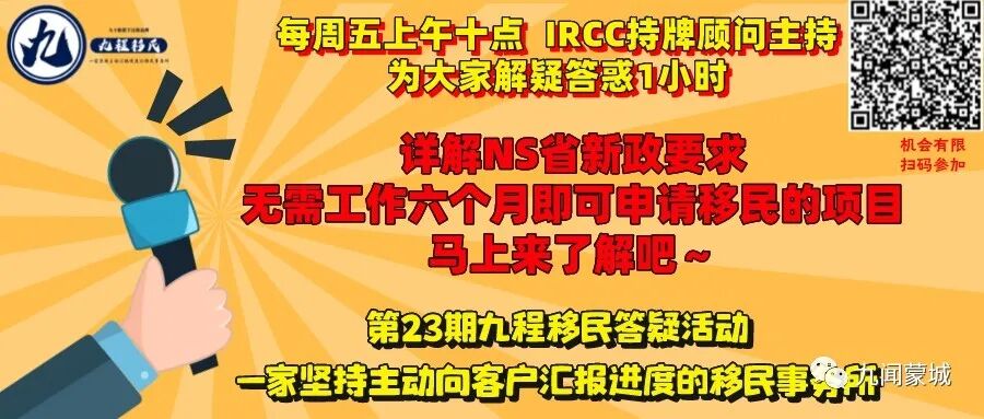 九程移民第23期移民沙龙问答活动将于今天(周五)早上10点举行,注册移民顾问将为大家详解NS省最新移民政策,欢迎大家进群参加!